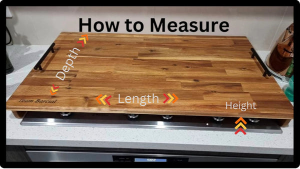 ALLOW 40mm EXTRA for the thickness of the risers, so add 40mm (2 x 20mm) to the left to right measurements, so it sits over your cooktop and not on it.Flat Pack, pre drilled for handles very easy to attach. Add a touch of elegance to your kitchen with this Stove Top Cover with Handles. I CAN MAKE CUSTOM SIZES or Sides all around, just send me your measurements for a quote.